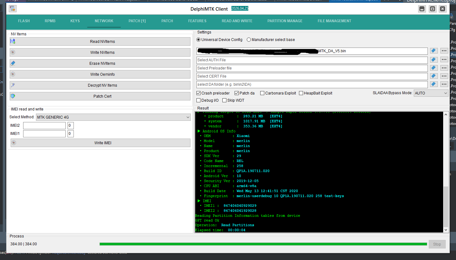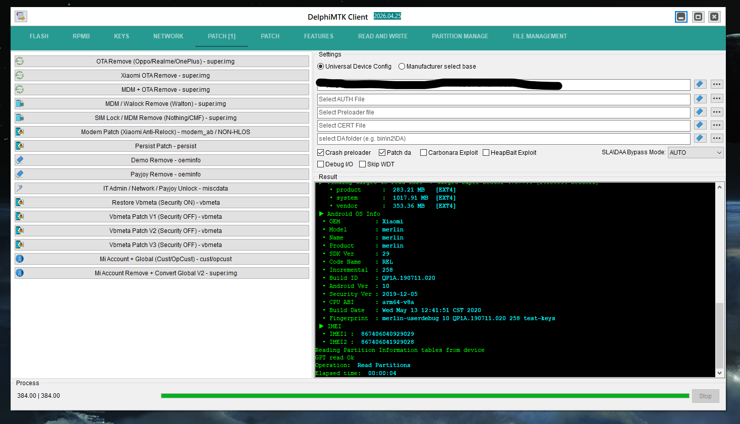 Hold boot key And Connect To PC (power off mode) Waiting for mediatek port (Timeout 3 minute) : Ok brom service detected Handshake device : Ok Reading device Info : Ok Ok Mediatek XFlash Detected! CPU Info : MT6768/MT6769 Helio G70/G80/G85 disabling WatchDog Timer WDT disabled Ok Hardware Sub Code : 0x8A00 Hardware Code : 0x707 Hardware Version : 0xCA00 Software Version : 0x00 Is Secure boot : True Serial Link authorization Protect : True download agent authorization Protect : True SWJTAG enabled: True EPP_PARAM at 0x600 after EMMC_BOOT/SDMMC_BOOT: False Root cert required: False Mem read auth: True Mem write auth: True Cmd 0xC8 blocked: True ME_ID: 0x1B1A97BD943F10FE97AC3D8E0F69B843 SOCID: 0xD597C6EF5EA660011AF11AED38CE555DE1461C227FF618C5C195E8432FF48DF7 Disabling Watchdog timer : Ok Sending payload : Ok Trying disable SLA\DAA Kamakiri : Ok Manual Preloader selected ! Choosing the right da : Ok Writing download agent : Ok Jumping Download Agent : Ok Sync signal : Ok Setup environment : Ok Setup param : Ok Connection Status : brom mode Sending emi : Ok uploading stage 2: Ok Bypassing DA SLA: . rnid : 40DDDD360A86399B4A3546D87AD1AAD4 . DA SLA Authentication : Ok Ok Adding DA Extensions: Ok ▶ Finding target to read info > target=super sector=4767744 (14680064 sectors) • product : 922.58 MB [EXT4] • system : 2.43 GB [EXT4] • vendor : 683.98 MB [EXT4] ▶ Android OS Info • OEM : Xiaomi • Model : M2003J15SC • Name : merlin_in • Product : merlin • Market Name : Redmi Note 9 • SDK Ver : 29 • Code Name : REL • Incremental : V11.0.3.0.QJOINXM • Build ID : QP1A.190711.020 • Android Ver : 10 • MIUI Ver : 9 • Security Ver : 2020-06-01 • Region : in • Timezone : Asia/Shanghai • CPU ABI : arm64-v8a • SW Ver : Android10_11 • Build Date : Fri Jul 3 20:23:54 CST 2020 • Fingerprint : merlin-user 10 QP1A.190711.020 V11.0.3.0.QJOINXM release-keys ▶ IMEI • IMEI1 : 867406040929029 • IMEI2 : 867406041929028